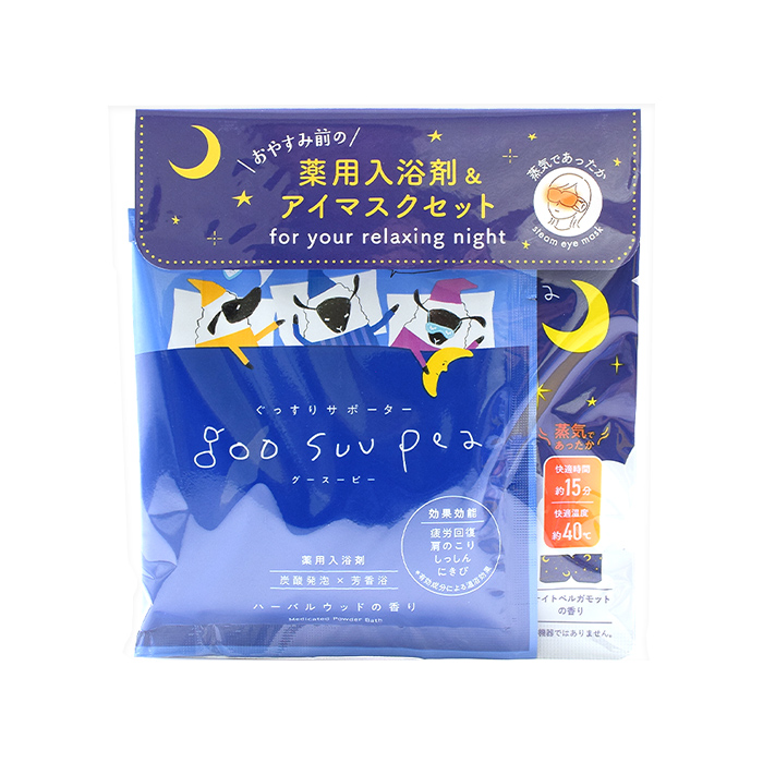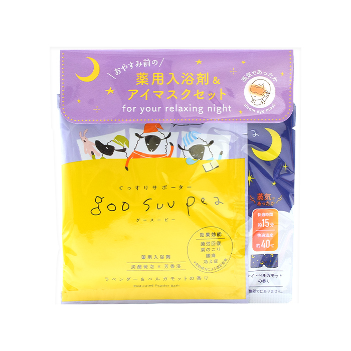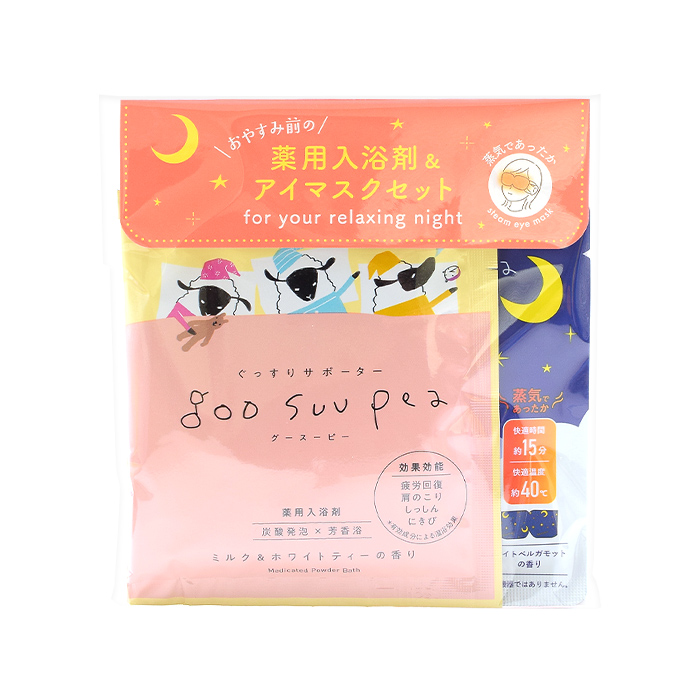 グースーピー入浴剤とスチームアイマスクがセットになったリラクゼーションギフト。 ゆったり入浴・疲れた目元を蒸気でやさしく温めてリラックスタイムを毎日の習慣に。 がんばる明日のために、今夜もぐっすりおやすみなさい。